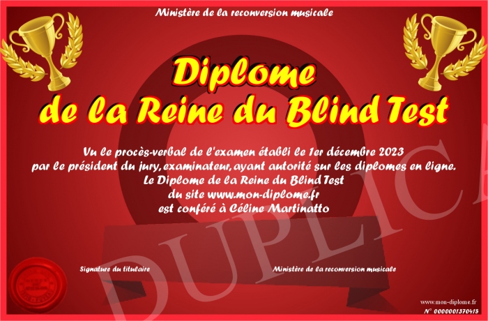 Envoyez par email votre Diplôme de la Reine du Blind Test personalisé