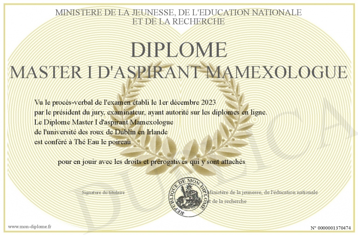 Envoyez par email votre Diplôme Master I d'aspirant Mamexologue personalisé