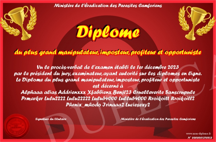 Envoyez par email votre Diplôme du plus grand manipulateur, imposteur, profiteur et opportuniste personalisé