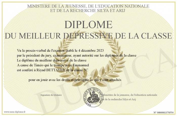 Envoyez par email votre Diplôme du meilleur depressive de la classe personalisé