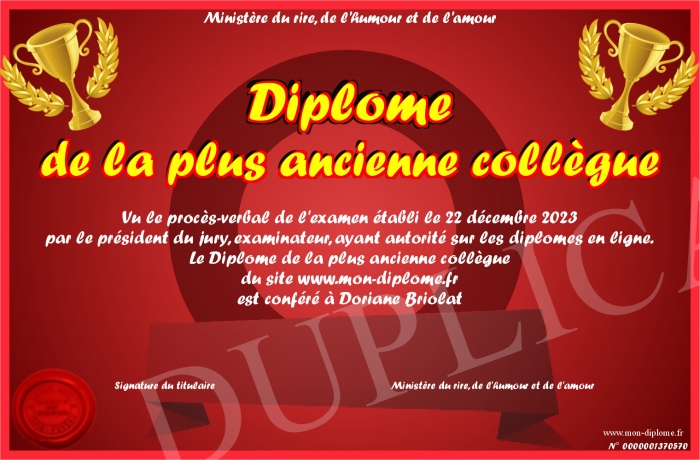 Envoyez par email votre Diplome de la plus ancienne collègue personalisé