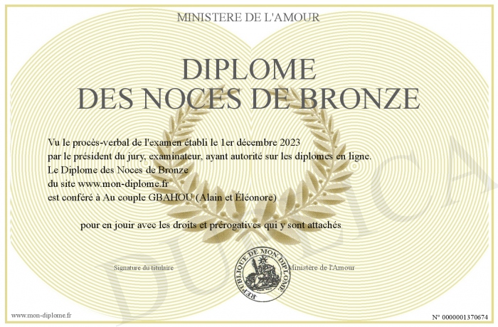 Envoyez par email votre Diplôme des Noces de Bronze personalisé