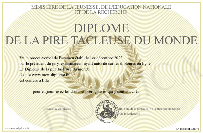 Envoyez par email votre Diplôme de la pire tacleuse du monde personalisé