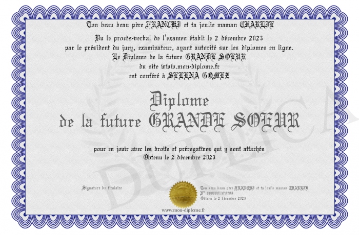 Envoyez par email votre Diplôme de la future GRANDE SOEUR personalisé