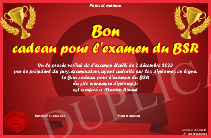 Envoyez par email votre Bon cadeau pour l'examen du BSR personalisé