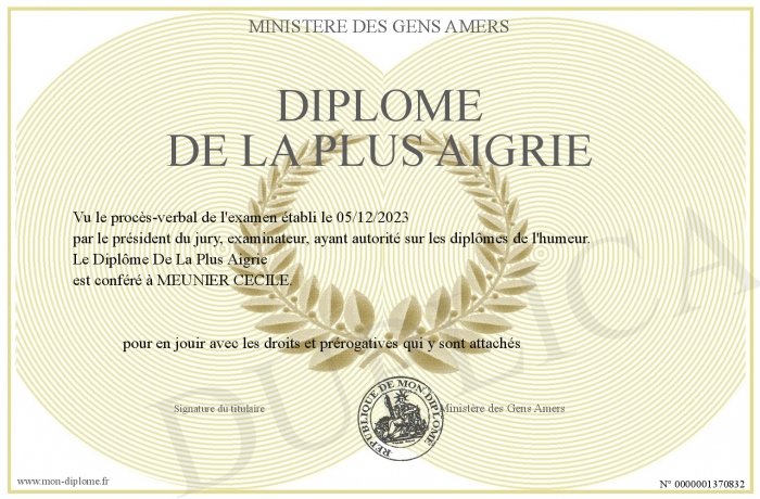 Envoyez par email votre Diplôme de la plus aigrie personalisé