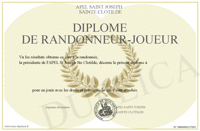 Envoyez par email votre Diplôme de Randonneur-joueur personalisé