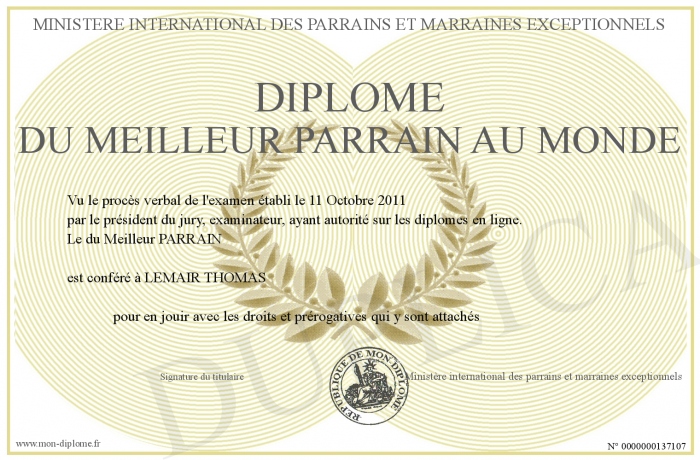 Envoyez par email votre Diplôme du meilleur parrain au monde personalisé