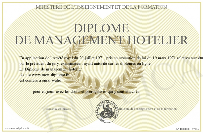Envoyez par email votre Diplôme de management hotelier personalisé