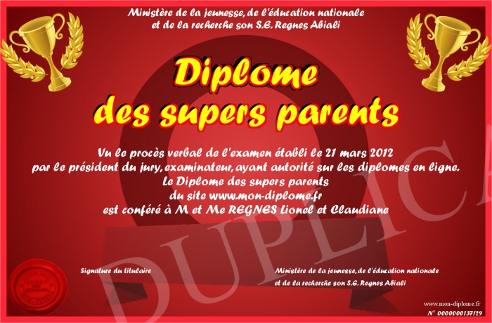 Envoyez par email votre Diplôme des supers parents personalisé