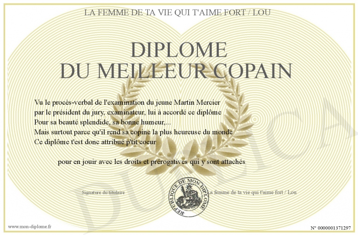 Envoyez par email votre Diplôme du meilleur copain personalisé