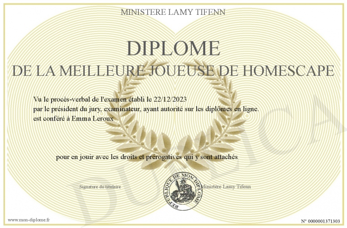 Envoyez par email votre Diplôme de la meilleure joueuse de Homescape personalisé
