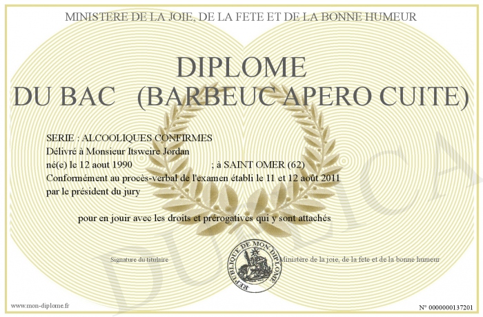 Envoyez par email votre DIPLOME DU BAC (BARBEUC APERO CUITE) personalisé