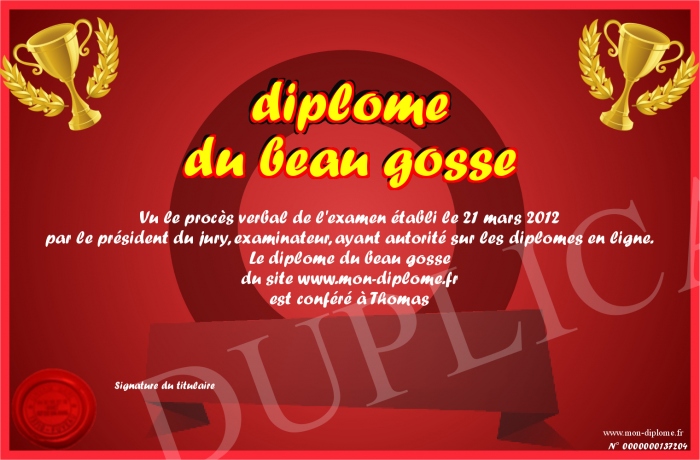 Envoyez par email votre diplome du beau gosse personalisé