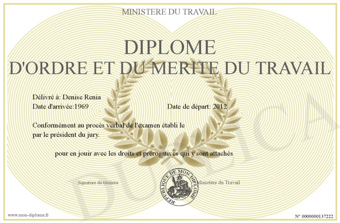 Envoyez par email votre Diplôme d'ordre et du mérite du travail personalisé