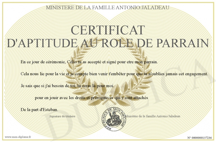 Envoyez par email votre certificat d'aptitude au rôle de parrain personalisé