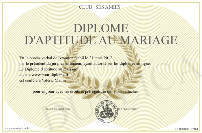 Envoyez par email votre Diplome d'aptitude au mariage personalisé
