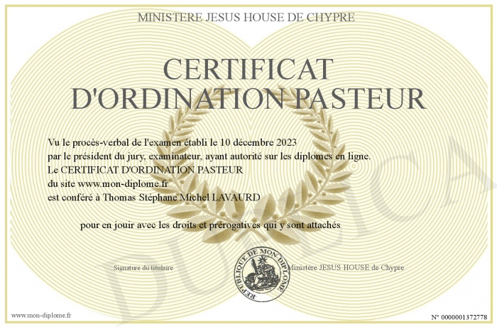 Envoyez par email votre CERTIFICAT D'ORDINATION PASTEUR personalisé