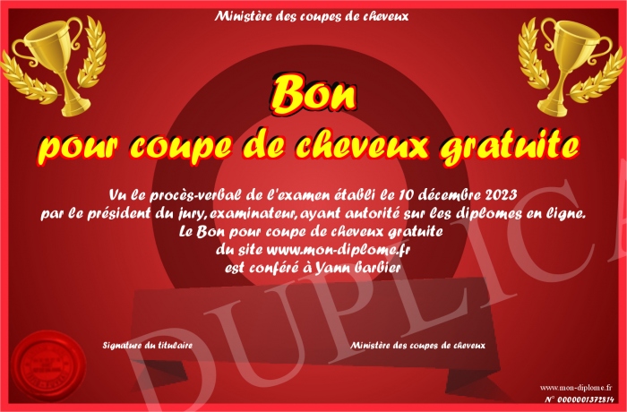 Envoyez par email votre Bon pour coupe de cheveux gratuite personalisé