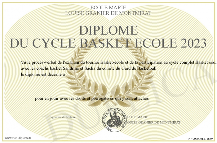 Envoyez par email votre Diplôme du cycle basket ecole 2023 personalisé