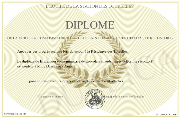 Envoyez par email votre Diplôme de la meilleur consommatrice de chocolats chauds (après l'effort, le réconfort) personalisé