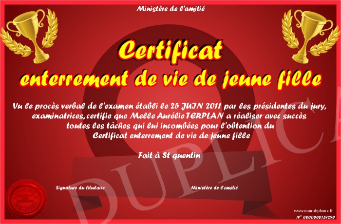 Envoyez par email votre Certificat enterrement de vie de jeune fille personalisé