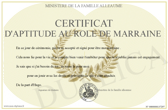 Envoyez par email votre certificat d'aptitude au rôle de marraine personalisé