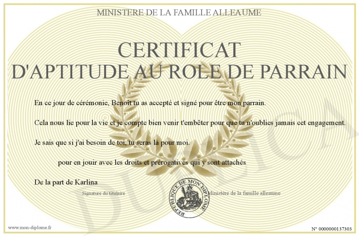 Envoyez par email votre certificat d'aptitude au rôle de parrain personalisé