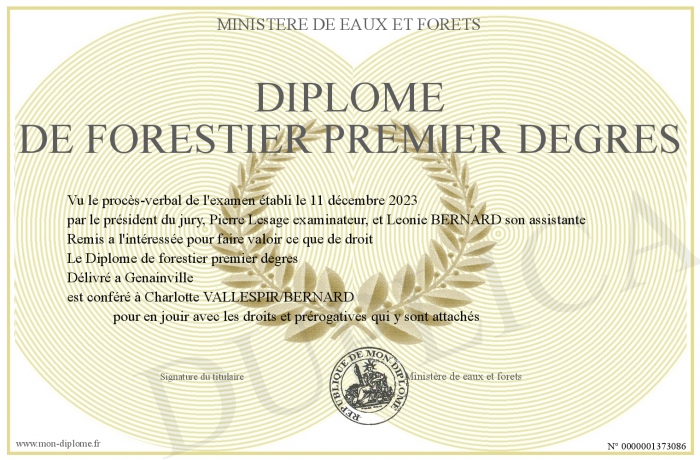 Envoyez par email votre Diplôme de forestier premier degres personalisé