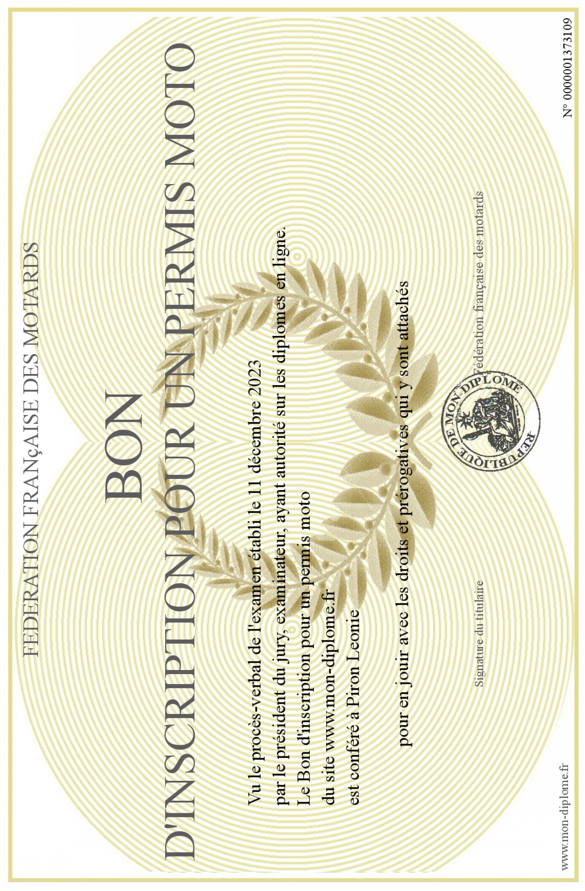 Envoyez par email votre Bon d'inscription pour un permis moto personalisé