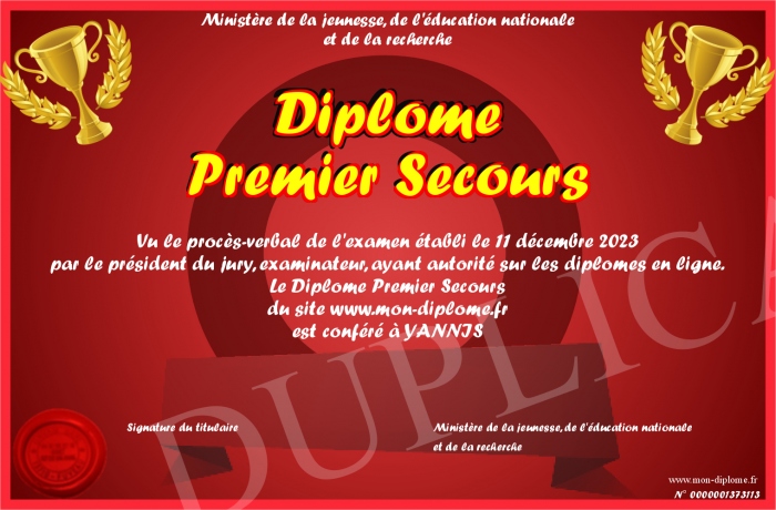 Envoyez par email votre Diplôme Premier Secours personalisé
