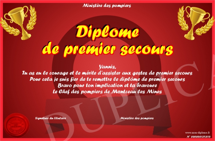 Envoyez par email votre Diplôme de premier secours personalisé
