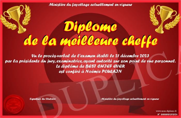 Envoyez par email votre Diplôme de la meilleure cheffe personalisé