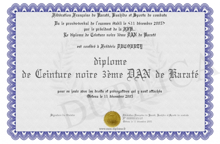 Envoyez par email votre diplome de Ceinture noire 3ème DAN de Karaté personalisé