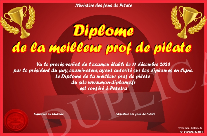 Envoyez par email votre Diplôme de la meilleur prof de pilate personalisé