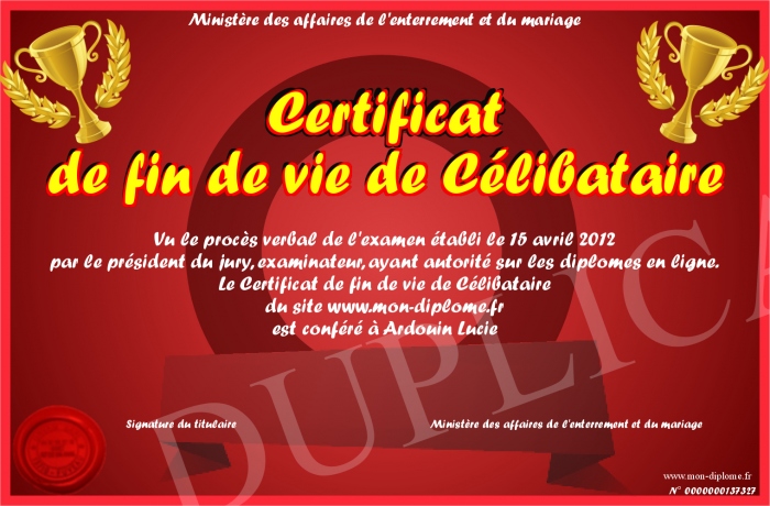 Envoyez par email votre Certificat de fin de vie de Célibataire personalisé