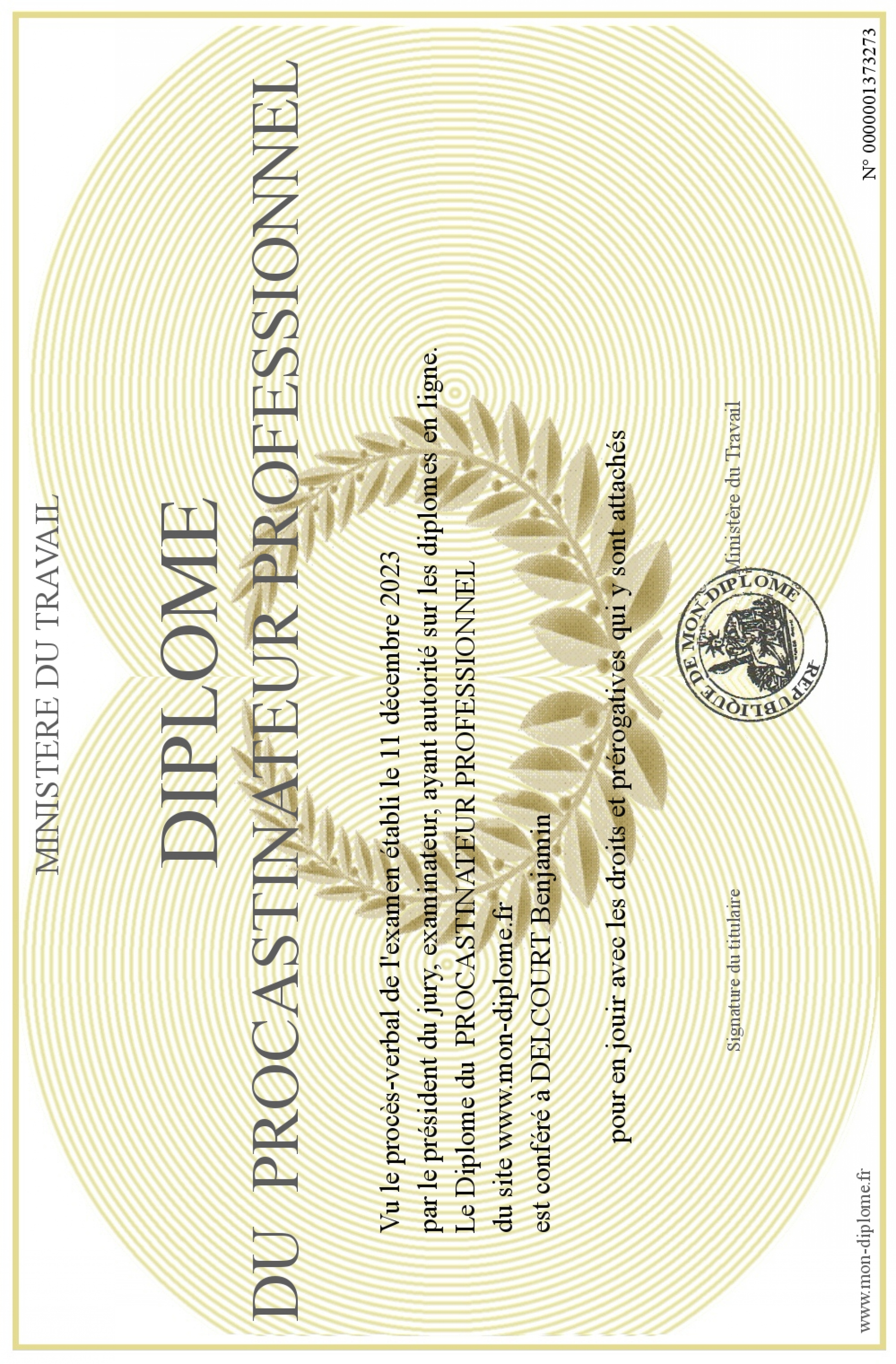 Envoyez par email votre Diplôme du PROCASTINATEUR PROFESSIONNEL personalisé