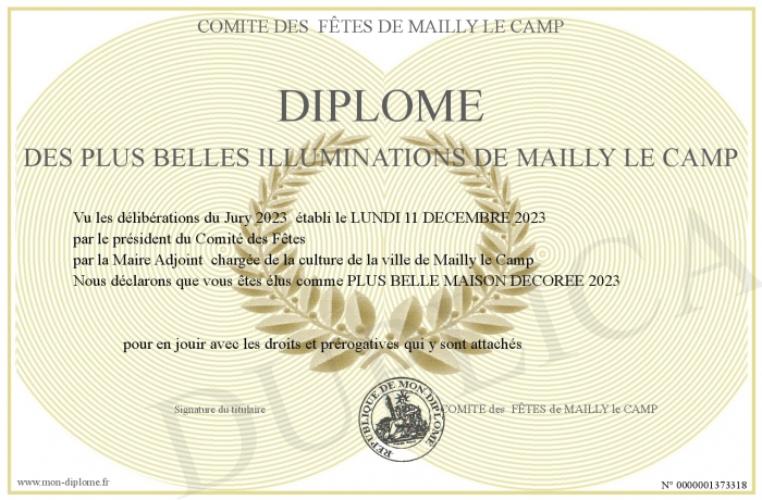 Envoyez par email votre Diplôme des plus belles illuminations de Mailly le Camp personalisé