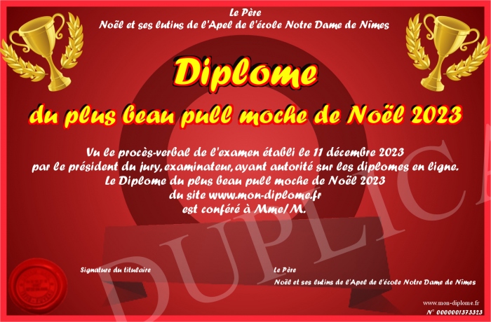 Envoyez par email votre Diplôme du plus beau pull moche de Noël 2023 personalisé