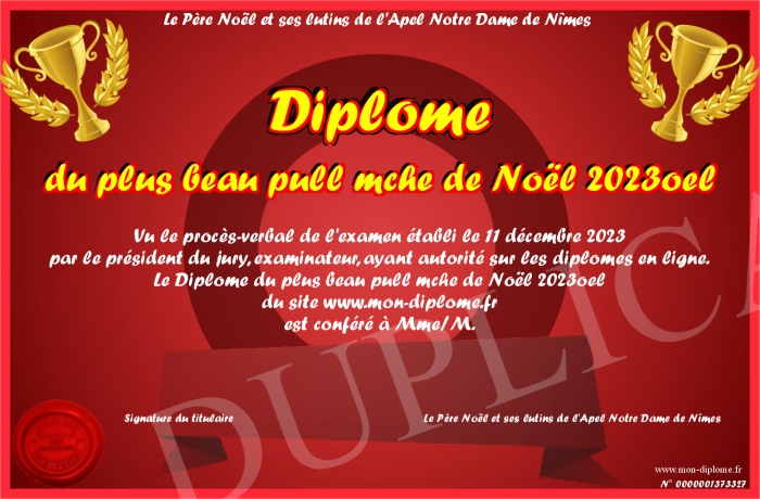 Envoyez par email votre Diplôme du plus beau pull mche de Noël 2023oel personalisé