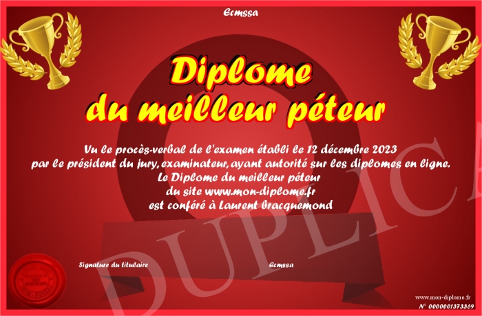 Envoyez par email votre Diplôme du meilleur péteur personalisé