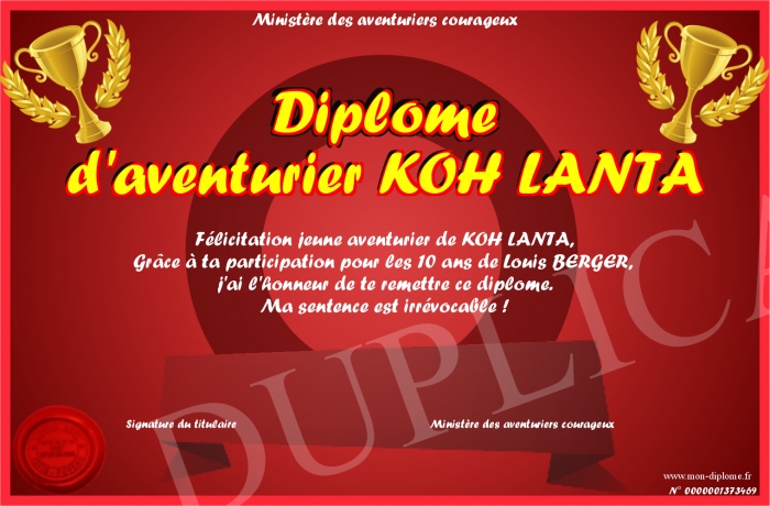 Envoyez par email votre Diplôme d'aventurier KOH LANTA personalisé