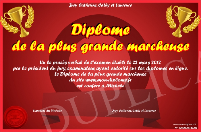Envoyez par email votre Diplôme de la plus grande marcheuse personalisé