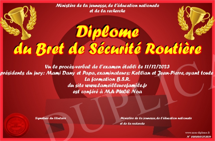 Envoyez par email votre Diplôme du Bret de Sécurité Routière personalisé