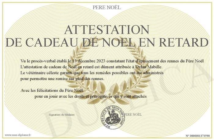 Envoyez par email votre ATTESTATION DE CADEAU DE NOEL EN RETARD personalisé
