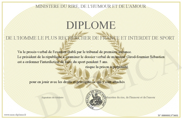 Envoyez par email votre Diplôme de l'homme le plus rechercher de France et interdit de sport personalisé