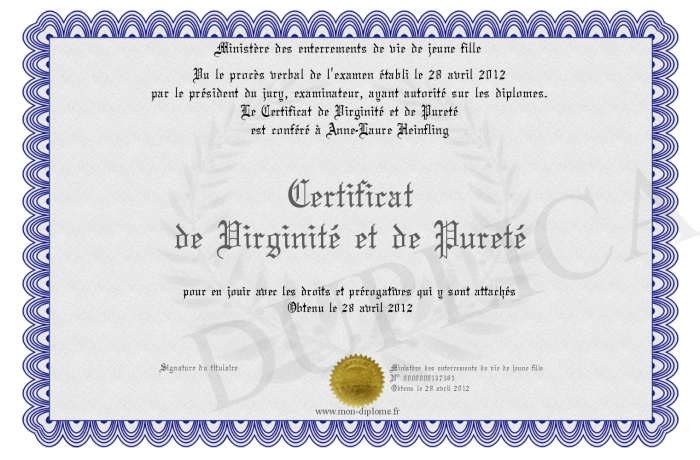 Envoyez par email votre Certificat de Virginité et de Pureté personalisé
