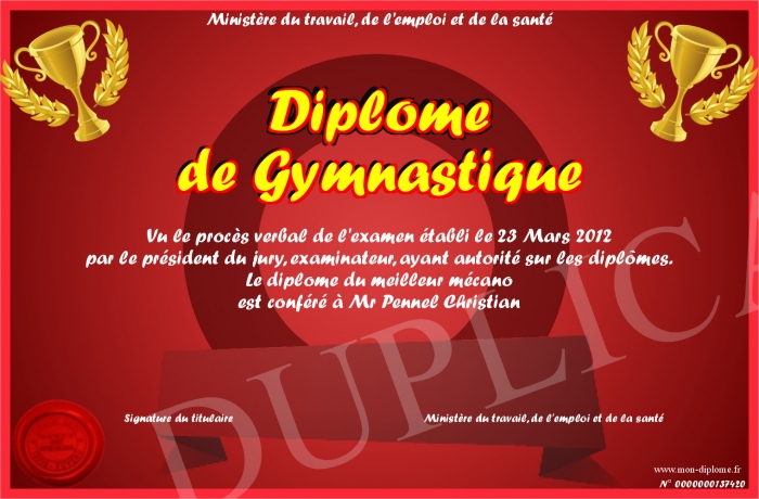 Envoyez par email votre Diplome de Gymnastique personalisé