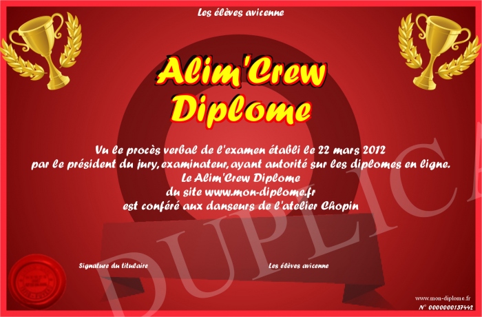 Envoyez par email votre Alim'Crew Diplome personalisé