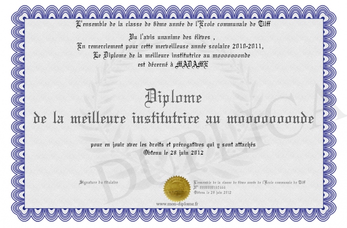Envoyez par email votre Diplôme de la meilleure institutrice au mooooooonde personalisé